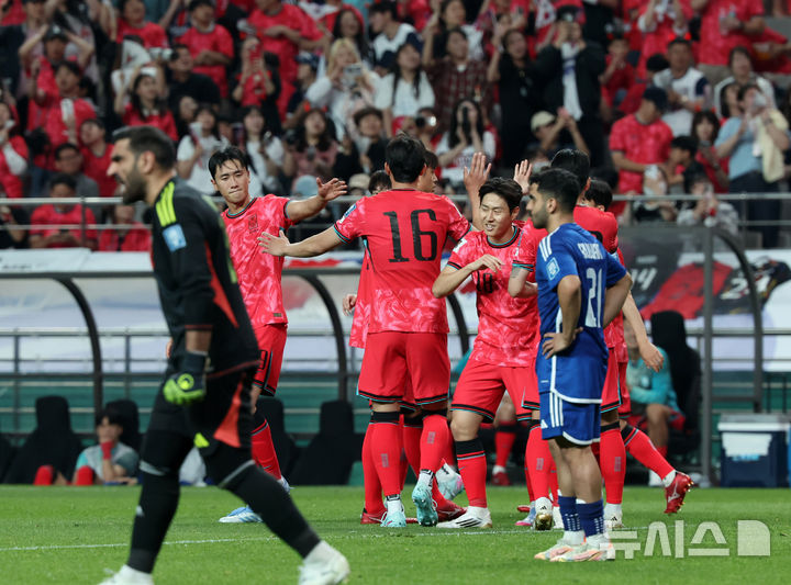 [서울=뉴시스] 김명년 기자 = 10일 서울 마포구 서울월드컵경기장에서 열린 2026 국제축구연맹(FIFA) 북중미월드컵 아시아 3차 예선 한국과 쿠웨이트의 경기, 한국 오현규가 세번째 골을 성공시킨 뒤 동료들과 기뻐하고 있다. 2025.06.10. [email protected]