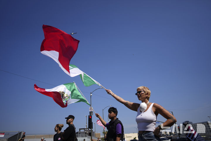 [로스앤젤레스=AP/뉴시스] 10일(현지 시간) 미 캘리포니아주 로스앤젤레스에서 멕시코 국기를 든 시위대가 이민세관단속국(ICE)의 불법 이민자 단속을 규탄하고 있다. 2025.06.11.