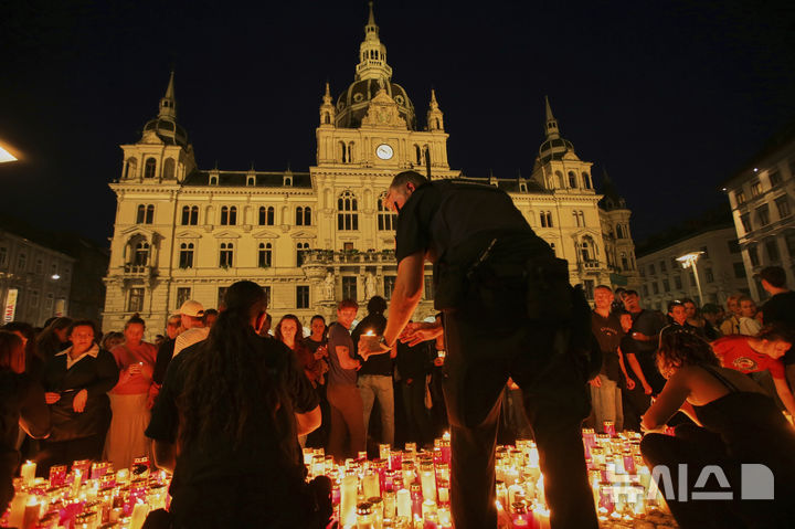 [그라츠=AP/뉴시스] 10일(현지 시간) 오스트리아 그라츠 시내 광장에서 시민들이 드라이어슈츠엔가세 중등학교 총기 난사 희생자들을 추모하는 촛불을 밝히고 있다. 경찰에 따르면, 이 학교에서 발생한 총기 난사로 최소 11명이 숨졌으며, 용의자는 스스로 목숨을 끊은 것으로 알려졌다. 총격범은 이 학교에 재학했던 21세 남성으로 전해졌다. 2025.06.11.