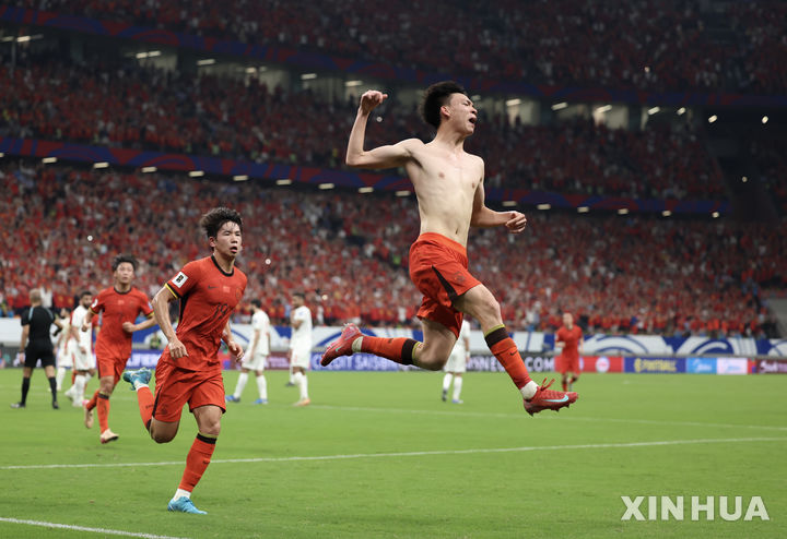 [충칭=신화/뉴시스] 중국의 왕위동이 10일(현지 시간) 중국 충칭 롱싱 축구 경기장에서 열린 2026 국제축구연맹(FIFA) 북중미 월드컵 아시아 지역 3차 예선 C조 최종전 바레인과의 경기 후반 추가 시간 페널티킥 결승 골을 넣은 후 환호하고 있다. 본선 진출 탈락이 확정된 중국이 졸전 끝에 1-0으로 승리해 조 5위로 최하위를 면하면서 일정을 마무리했다. 2025.06.11.
