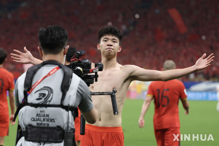 [충칭=신화/뉴시스] 중국의 왕위동이 10일(현지 시간) 중국 충칭 롱싱 축구 경기장에서 열린 2026 국제축구연맹(FIFA) 북중미 월드컵 아시아 지역 3차 예선 C조 최종전 바레인과의 경기 후반 추가 시간 페널티킥 결승 골을 넣은 후 세리머니하고 있다. 본선 진출 탈락이 확정된 중국이 졸전 끝에 1-0으로 승리해 조 5위로 최하위를 면하면서 일정을 마무리했다. 2025.06.11.