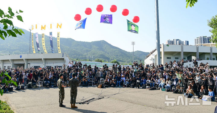 [연천=뉴시스] 김혜진 기자 = 군 복무를 마친 방탄소년단 정국(왼쪽), 지민이 11일 오전 경기도 연천군의 한 부대 인근에서 전역 인사를 하고 있다. 2025.06.11. [email protected]