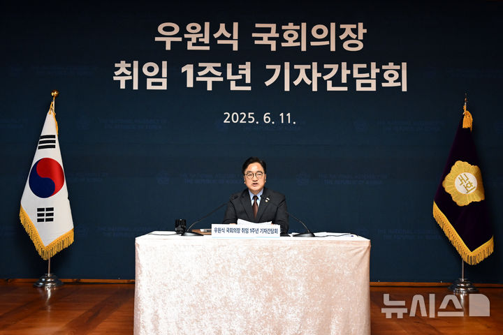 [서울=뉴시스] 국회사진기자단 = 우원식 국회의장이 11일 서울 여의도 국회 사랑재에서 열린 취임 1주년 기자간담회에서 취재진 질문에 답하고 있다. 2025.06.11. [email protected]