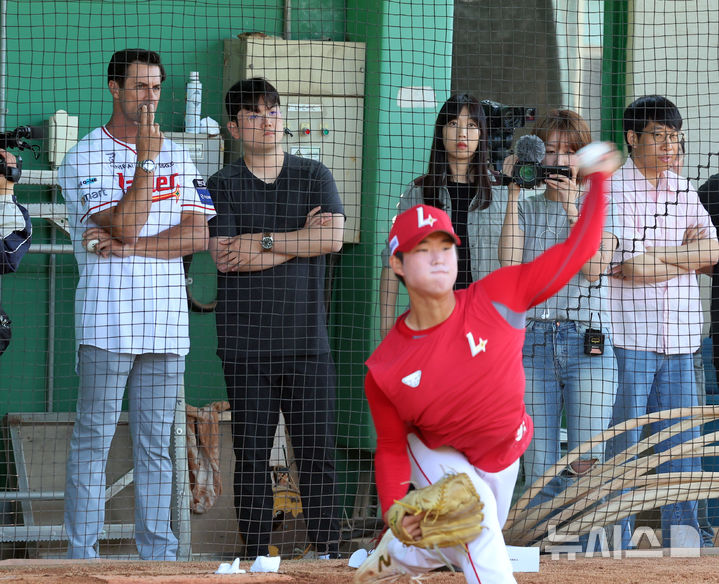 [인천=뉴시스] 전진환 기자 = 메이저리그에서 투수로 활약한 콜 헤멀스가 11일 오전 인천 강화군 SSG 퓨처스필드에서 열린 MLB 레전드 멘토링 데이에서 퓨처스 투수의 투구를 지켜보고 있다. 2025.06.11. [email protected]