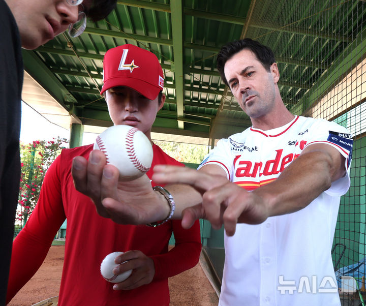 [인천=뉴시스] 전진환 기자 = 메이저리그에서 투수로 활약한 콜 해멀스가 11일 오전 인천 강화군 SSG 퓨처스필드에서 열린 MLB 레전드 멘토링 데이에서 퓨처스 투수에게 볼 그립에 대해 코칭하고 있다. 2025.06.11. [email protected]