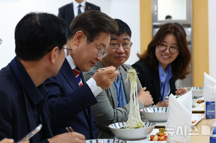 [서울=뉴시스] 최진석 기자 = 이재명 대통령이 11일 서울 용산 대통령실 기자식당에서 출입기자들과 식사를 하고 있다. 2025.06.11. [email protected]
