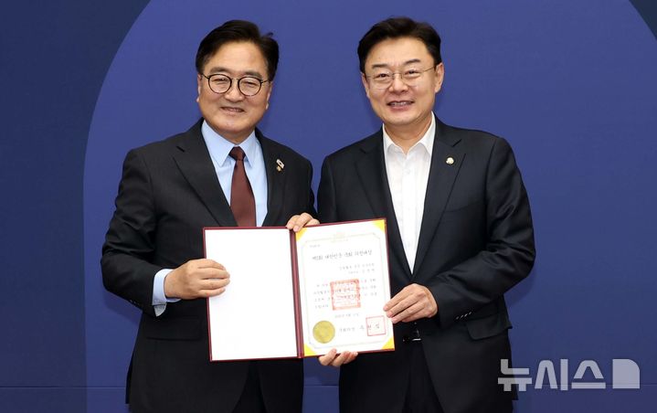 [서울=뉴시스] 조성봉 기자= 우원식 국회의장이 11일 오후 서울 여의도 국회에서 열린 제5회 대한민국 국회 의정대상 시상식에서 입법활동 부문 우수의원으로 수상을 한 김성원 국민의힘 의원과 기념촬영을 하고 있다. 2025.06.11. [email protected]