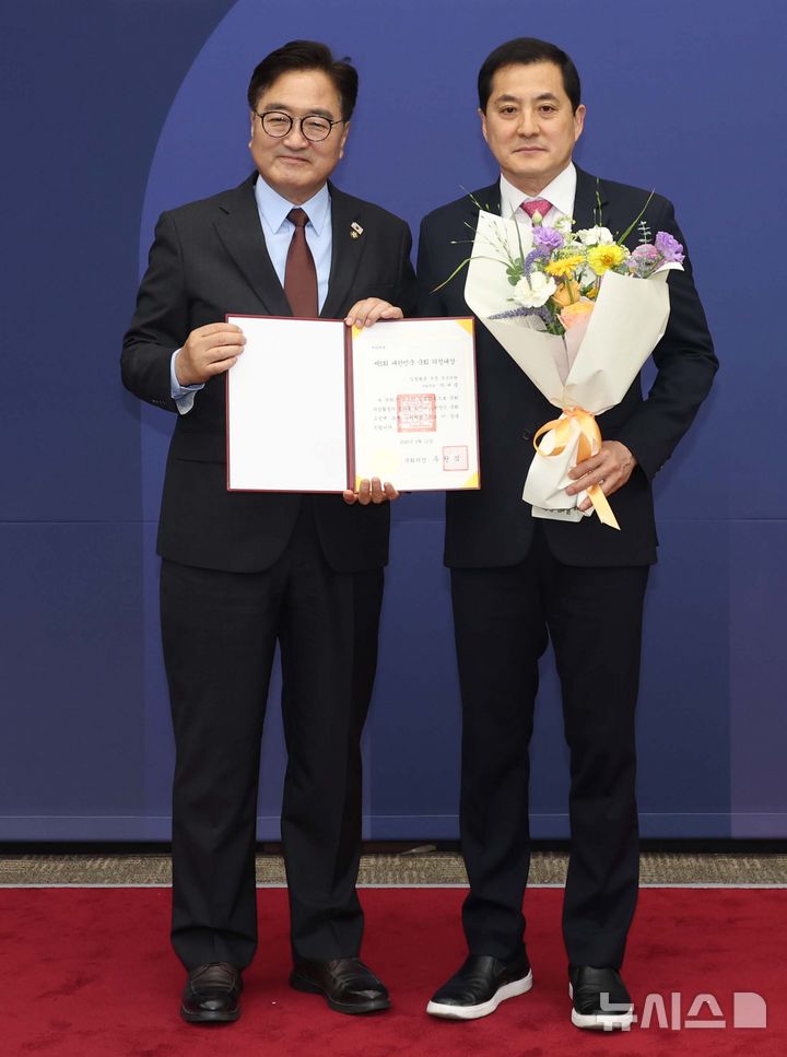 [서울=뉴시스] 조성봉 기자= 우원식 국회의장이 11일 오후 서울 여의도 국회에서 열린 제5회 대한민국 국회 의정대상 시상식에서 입법활동 부문 우수의원으로 수상을 한 박대출 국민의힘 의원과 기념촬영을 하고 있다. 2025.06.11. [email protected]