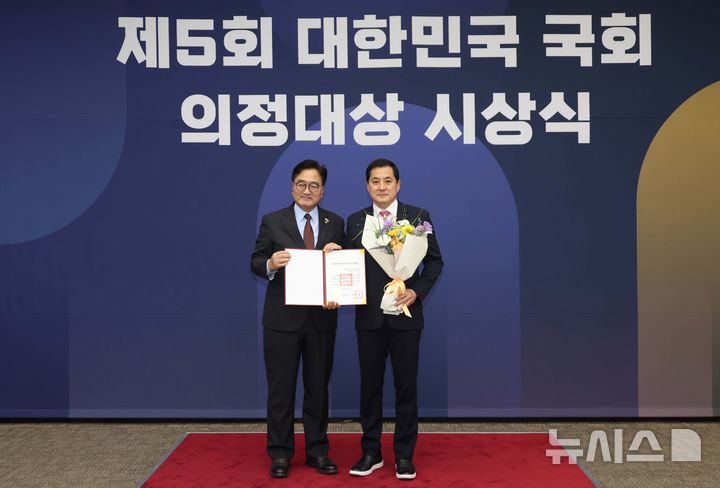 [서울=뉴시스] 조성봉 기자= 우원식 국회의장이 11일 오후 서울 여의도 국회에서 열린 제5회 대한민국 국회 의정대상 시상식에서 입법활동 부문 우수의원으로 수상을 한 박대출 국민의힘 의원과 기념촬영을 하고 있다. 2025.06.11. [email protected]