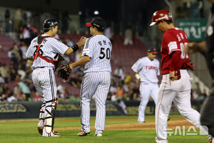 [서울=뉴시스] 김선웅 기자 = 11일 서울 송파구 잠실야구장에서 열린 2025 프로야구 SSG 랜더스와 LG 트윈스의 경기, 6-4로 승리를 거둔 LG 장현식 등 선수들이 기쁨을 나누고 있다. 2025.06.11. [email protected]