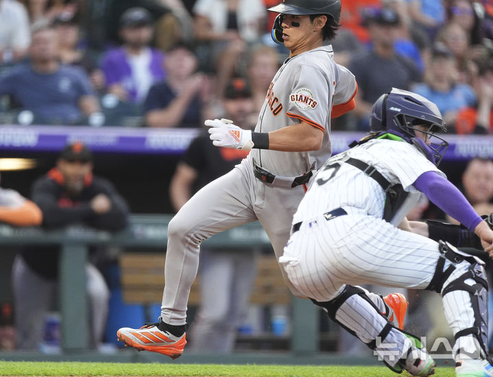 [덴버=AP/뉴시스] 샌프란시스코 자이언츠의 이정후가 11일(현지 시간) 미 콜로라도주 덴버의 쿠어스 필드에서 열린 2025 메이저리그 콜로라도 로키스와의 경기 3회 초 3루타 진루 후 윌리 아다메스의 희생플라이에 득점하고 있다. 2025.06.12.