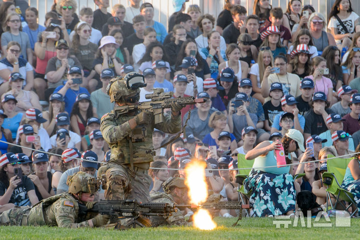 [포트마이어=AP/뉴시스] 11일(현지 시간) 미 버지니아주 포트마이어 마이어-헨더슨 합동기지에서 미 육군 창설 제250주년(14일)을 기념해 열린 육군 전통 행사 ‘트와일라잇 타투'(Twilight Tattoo)’에서 미 육군 병사들이 전술 시범을 보이고 있다. '트와일라잇 타투'는 미 육군 군악대, 명예 근위대, 의장대, 낙하산병, 전통 복장 착용 병사 등이 등장해, 건국 시기부터 현대에 이르기까지의 군사 활동을 재현하거나 공연하는 행사다. 2025.06.12.