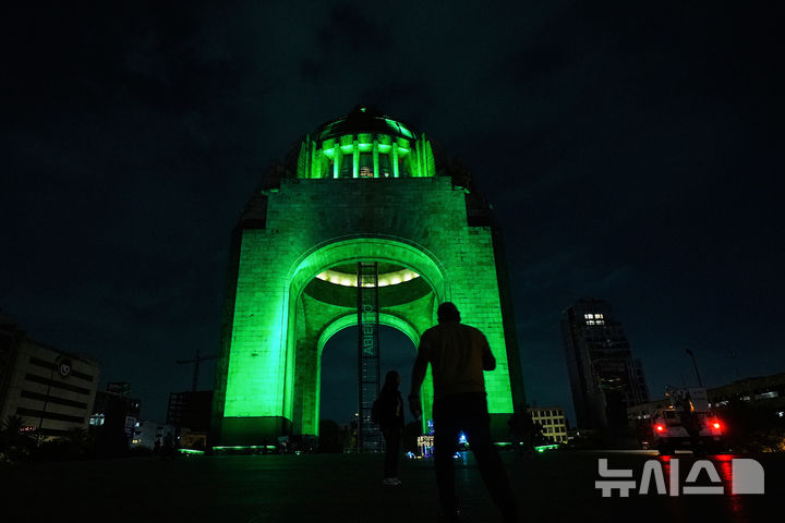 [멕시코시티=AP/뉴시스] 11일(현지 시간) 멕시코 수도 멕시코시티에서 2026 국제축구연맹(FIFA) 북중미 월드컵 개막을 1년 앞두고 카운트다운을 시작해 녹색 조명이 비친 혁명기념탑을 시민들이 촬영하고 있다. 2025.06.12.
