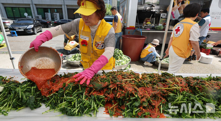 [인천=뉴시스] 전진환 기자 =12일 오전 인천 연수구 대한적십자사 인천지사에서 적십자봉사회 남동구협의회 봉사원들이 관내 홀몸 어르신 등 취약계층의 건강한 여름나기를 위해 '사랑의 열무김치 나눔' 봉사활동을 하고 있다. 2025.06.12. [email protected]