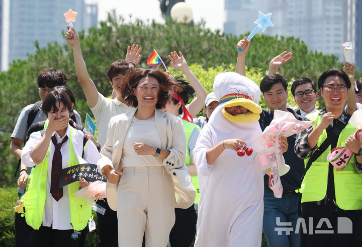 [서울=뉴시스] 고승민 기자 = 12일 서울 여의도 국회에서 열린 진보당 손솔 의원 등원식에서 손 의원과 청년 참석자들이 퍼포먼스를 하고 있다. 2025.06.12. [email protected]