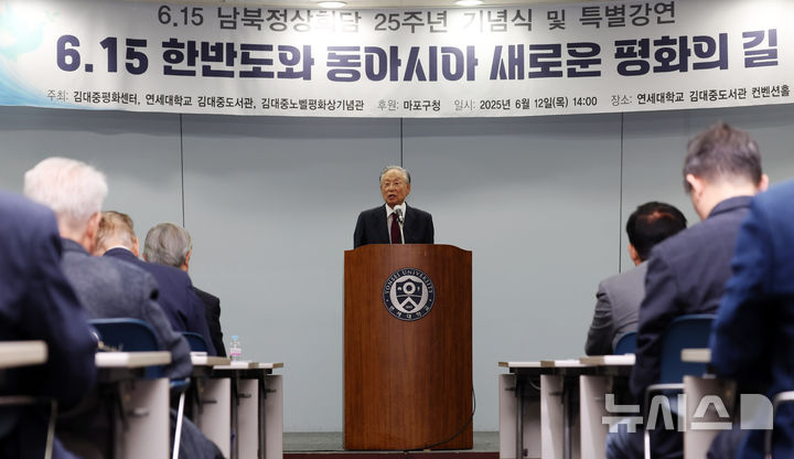 [서울=뉴시스] 김명년 기자 = 권노갑 김대중재단 이사장이 12일 오후 서울 마포구 연세대 김대중도서관에서 열린 6.15 남북정상회담 25주년 기념식에서 축사하고 있다. 2025.06.12. [email protected]