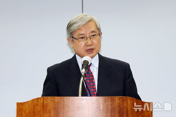 [서울=뉴시스] 김명년 기자 = 김성재 김대중노벨평화상기념관 이사장이 12일 오후 서울 마포구 연세대 김대중도서관에서 열린 6.15 남북정상회담 25주년 기념식에서 기념사하고 있다. 2025.06.12. [email protected]