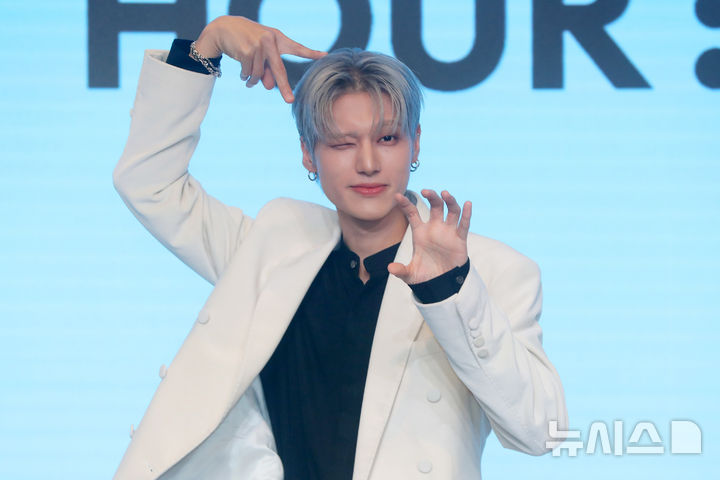 [서울=뉴시스] 김혜진 기자 = 그룹 에이티즈 우영이 12일 오후 서울 마포구 호텔 나루 서울 엠갤러리에서 열린 미니 12집 '골든 아워 : 파트 3(GOLDEN HOUR : Part.3)' 발매 기념 기자간담회에서 포즈를 취하고 있다. 2025.06.12. [email protected]