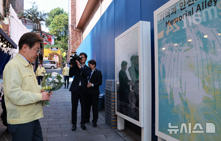 [서울=뉴시스] 고범준 기자 = 이재명 대통령이 12일 서울 용산구 이태원 참사 현장 '10·29 기억과 안전의 길'을 찾아 희생자를 추모하며 헌화하고 있다. (대통령실통신사진기자단) 2025.06.12. [email protected]