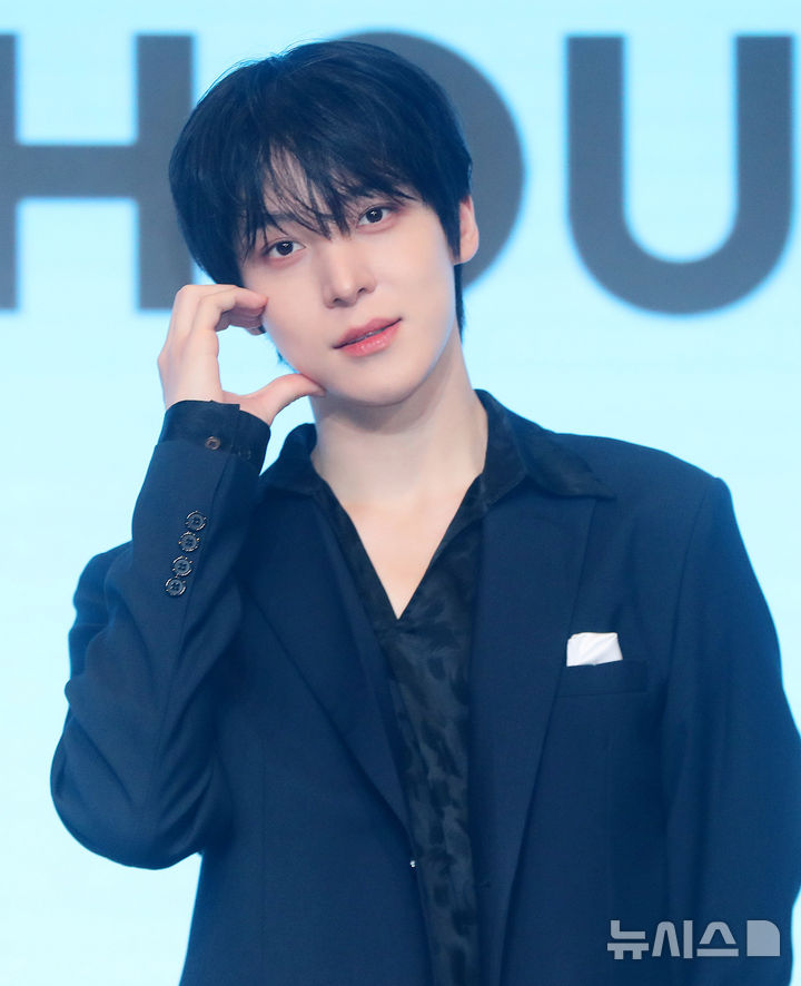[서울=뉴시스] 김혜진 기자 = 그룹 에이티즈 윤호가 12일 오후 서울 마포구 호텔 나루 서울 엠갤러리에서 열린 미니 12집 '골든 아워 : 파트 3(GOLDEN HOUR : Part.3)' 발매 기념 기자간담회에서 포즈를 취하고 있다. 2025.06.12. [email protected]