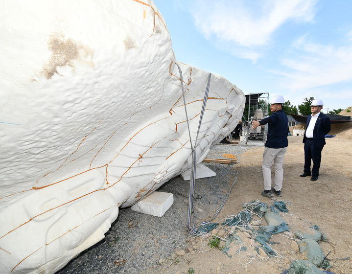 [서울=뉴시스] 김근수 기자 = 최응천(오른쪽) 국가유산청장이 12일 경북 경주시 남산 열암곡마애불상의 바로 세우기를 위한 지반 안정성 등을 점검하고자 마련된 모의실험장에서 실대형 불상 석재 모형 제작현장을 살펴보고 있다. (사진= 국가유산청 제공) 2025.06.12. [email protected]