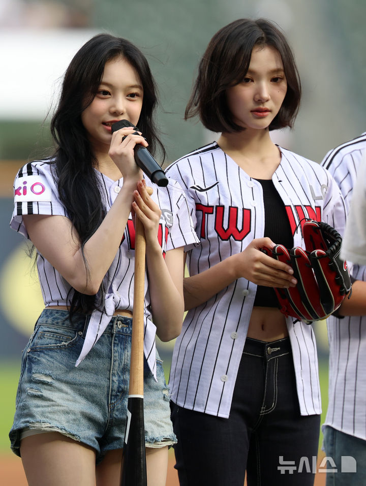 [서울=뉴시스] 이영환 기자 = 12일 오후 서울 송파구 잠실야구장에서 열린 2025 KBO리그 SSG 랜더스와 LG 트윈스의 경기, 하츠투하츠 지우와 이안이 시구와 시타에 앞서 인사말을 하고 있다. 2025.06.12. [email protected]