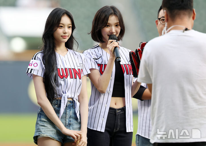 [서울=뉴시스] 이영환 기자 = 12일 오후 서울 송파구 잠실야구장에서 열린 2025 KBO리그 SSG 랜더스와 LG 트윈스의 경기, 하츠투하츠 지우와 이안이 시구와 시타에 앞서 인사말을 하고 있다. 2025.06.12. [email protected]