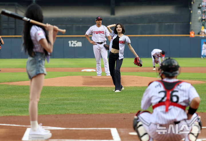 [서울=뉴시스] 이영환 기자 = 12일 오후 서울 송파구 잠실야구장에서 열린 2025 KBO리그 SSG 랜더스와 LG 트윈스의 경기, 하츠투하츠 지우와 이안이 시구와 시타를 하고 있다. 2025.06.12. [email protected]