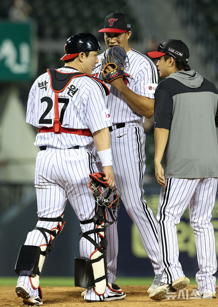 [서울=뉴시스] 이영환 기자 = 12일 오후 서울 송파구 잠실야구장에서 열린 2025 KBO리그 SSG 랜더스와 LG 트윈스의 경기, 6회초 무사 1,2의 위기가 찾아오자 LG 포수 박동원이 마운드에 올라 선발투수 치리노스와 대화를 하고 있다. 2025.06.12. [email protected]