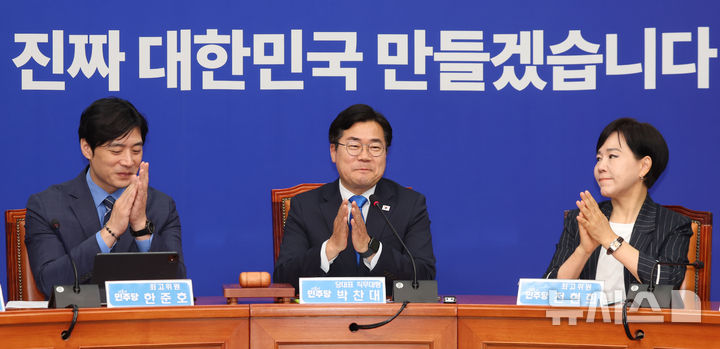 [서울=뉴시스] 권창회 기자 = 박찬대 더불어민주당 당대표 직무대행 겸 원내대표외 초최고위원들이 13일 오전 서울 여의도 국회에서 열린 최고위원회의를 마치고 박수치고 있다. 2025.06.13. [email protected]