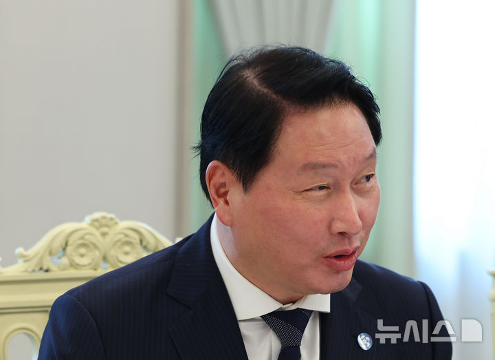 [서울=뉴시스] 최진석 기자 = 최태원 SK그룹 회장 겸 대한상공회의소회장이 13일 서울 용산 대통령실에서 열린 이재명 대통령과의 6경제단체와 기업인 간담회에서 발언하고 있다. 2025.06.13. [email protected]