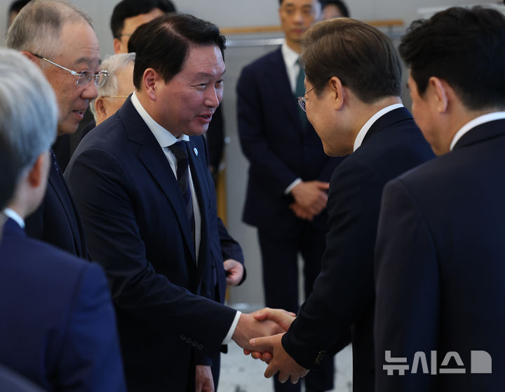 [서울=뉴시스] 최진석 기자 = 이재명 대통령이 13일 서울 용산 대통령실에서 열린 6경제단체와 기업인 간담회에 입장하며 최태원 SK그룹 회장 겸 대한상의회장과 악수하고 있다. 2025.06.13. [email protected]