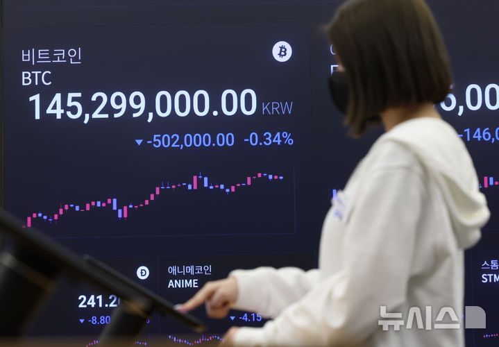 [서울=뉴시스] 황준선 기자 = 이스라엘의 이란 공습 여파로 비트코인의 가격이 10만 4000달러까지 하락하는 등 투자 불안 심리가 고조되고 있는 13일 서울 강남구 업비트 고객센터 전광판에 비트코인 거래가격이 표시되고 있다. 2025.06.13. [email protected]