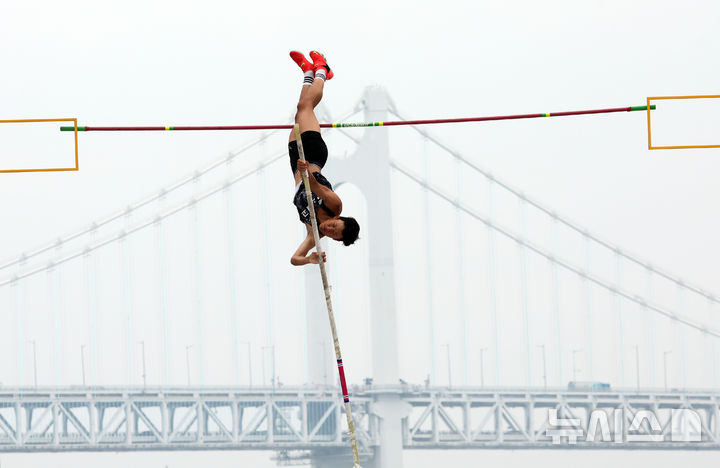 [부산=뉴시스] 하경민 기자 = '2025 부산 국제 장대높이뛰기 경기대회'가 열린 13일 부산 수영구 광안리해수욕장 특설경기장에서 20세 이하 남자부에 출전한 한국의 조성우가 기량을 뽐내고 있다.