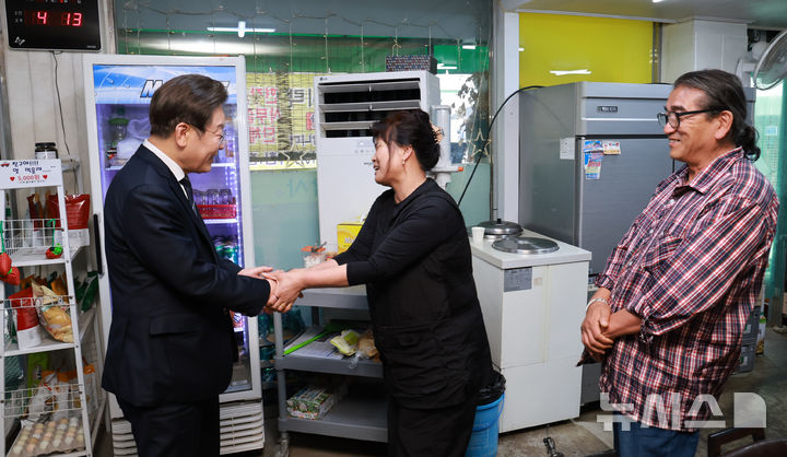 [연천=뉴시스] 고범준 기자 = 이재명 대통령이 13일 기본소득 실시지역 현황점검을 위해 방문한 경기도 연천군 식당에서 주인과 대화하고 있다. (대통령실통신사진기자단) 2025.06.13. [email protected]