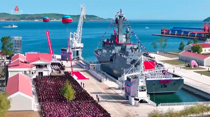 북한은 지난달 진수식 중 쓰러진 5000t급 구축함을 복구해 진수식을 열었다. 진수식에 참석한 김정은 국무위원장은 사고 덕에 병폐를 해결했다고 의미를 부여하면서 내년 5000t급 구축함 2척을 추가로 건조할 계획이라고 했다. (사진 = 조선중앙TV 캡처) 2025.06.13. [email protected]