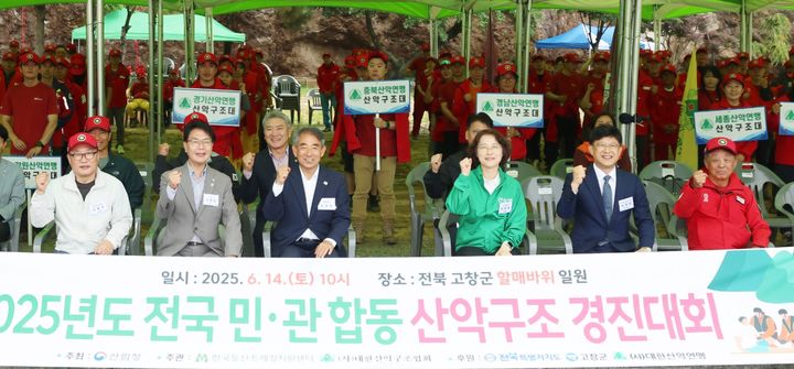 [고창=뉴시스] 김양수 기자 = 이미라(앞줄 오른쪽 세 번째) 산림청 차장과 윤준병 국회의원 등 관계자들이 14일 전북 고창군에서 열린 '2025년 전국 민·관 합동 산악구조경진대회'를 참관하고 있다. 이날 이 차장은 "이 대회는 산악사고 발생 시 신속하게 구조할 수 있도록 대원들의 역량 강화는 물론 산악사고 예방과 안전한 숲길 문화확산에 크게 기여할 것"이라고 말했다. (사진=산림청 제공) 2025.06.14. [email protected]