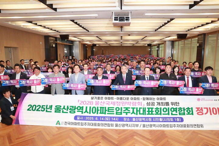 [울산=뉴시스] 조현철 기자 = 울산광역시아파트입주자대표회의연합회 2025년 상반기 정기이사회가 14일 울산시청 시민홀에서 열린 가운데 김두겸 울산시장과 임길홍 연합회장, 김원일 전국회장, 김기현·박성민 국회의원, 이성룡 시의회 의장, 안승대 울산시 행정부시장, 임현철 울산시 대변인 등이 기념촬영을 하고 있다. (사진=울산시 제공) 2025.06.14. [email protected]