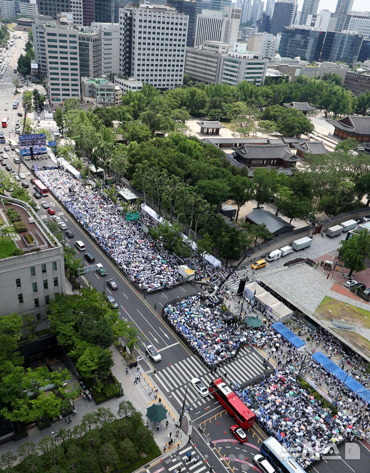 [서울=뉴시스] 추상철 기자 = 거룩한방파제 통합국민대회 준비위원회가 14일 오후 서울 중구 서울시의회 인근에서 동성애 퀴어축제와 차별금지법 제정 시도에 반대하는 '거룩한방파제 통합국민대회'를 하고 있다. 2025.06.14. [email protected]
