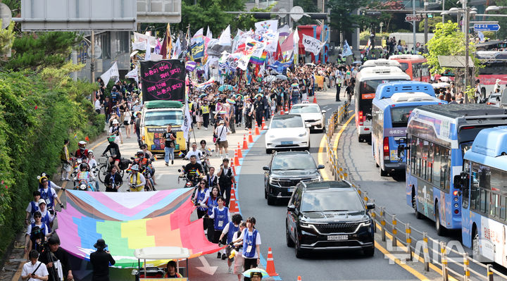 [서울=뉴시스] 김선웅 기자 = 14일 서울 중구 을지로 일대에서 열린 제26회 서울퀴어문화축제 참가자들이 퀴어퍼레이드를 하고 있다. (공동취재) 2025.06.14. [email protected]