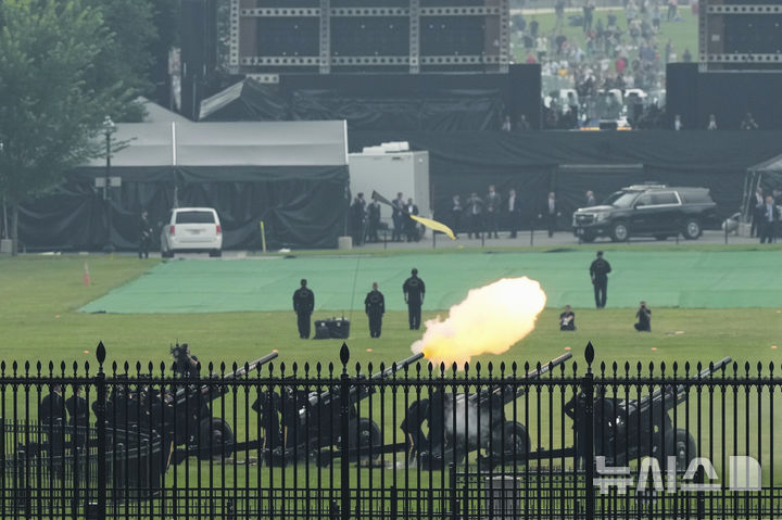 [워싱턴=AP/뉴시스] 14일(현지 시간) 워싱턴에서 열린 미 육군 창설 250주년 기념행사에서 군인들이 예포 21발을 발사하고 있다. 이날은 도널드 트럼프 대통령의 79번째 생일이기도 하다. 2025.06.15.