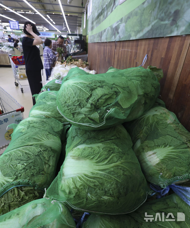 [서울=뉴시스] 김근수 기자 = 15일 서울 시내의 한 대형마트 매대에 배추가 진열돼 있다.
