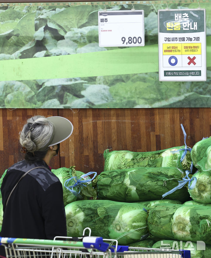 [서울=뉴시스] 김근수 기자 = 15일 서울 시내의 한 대형마트에서 시민이 배추를 고르고 있다.