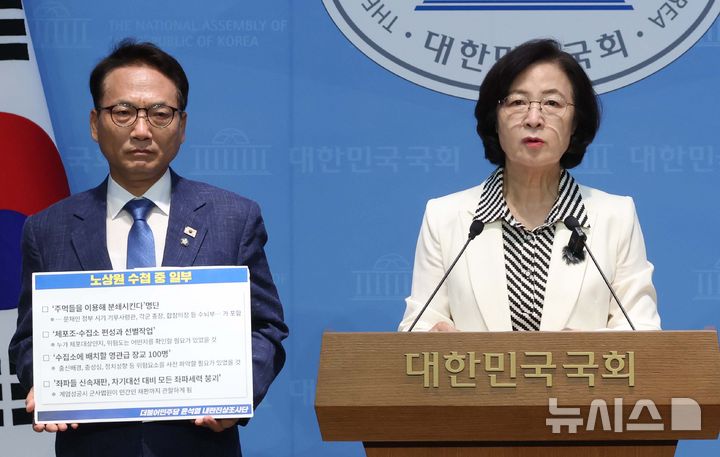 [서울=뉴시스] 조성봉 기자 = 추미애 , 박선원 더불어민주당 의원이 15일 오전 서울 여의도 국회 소통관에서 '내란 핵심 종사자들에 대한 검찰의 즉각 추가 기소' 를 촉구하는 기자회견을 하고 있다. 2025.06.15. [email protected]