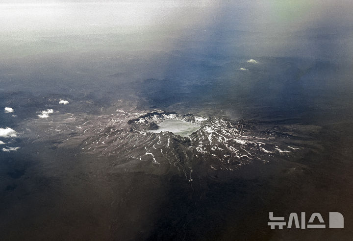[옌볜=뉴시스] 정병혁 기자 = 지난 13일 연길공항에서 인천공항으로 가는 비행기에서 바라본 백두산 천지가 장관을 이루고 있다. (공동취재) 2025.06.15. [email protected]