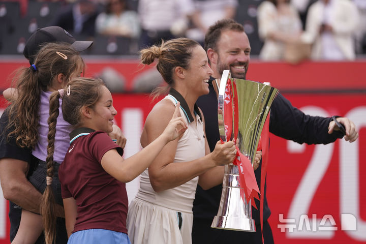 [런던=AP/뉴시스] 타티아나 마리아(46위·독일)가 15일(현지 시간) 영국 런던 퀸스클럽에서 열린 여자프로테니스(WTA) 투어 HSBC 챔피언십(WTA500) 정상에 올라 트로피를 들고 가족과 함께 포즈를 취하고 있다. 37세의 백전노장 마리아는 결승에서 아만다 아니시모바(15위·미국)를 2-0(6-3 6-4)으로 꺾고 우승을 차지했으며 순위도 86위에서 46위로 껑충 뛰어올랐다. 2025.06.16.