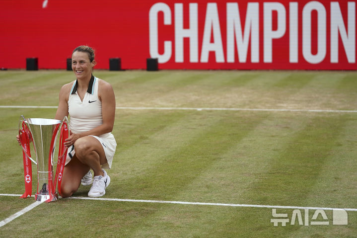 [런던=AP/뉴시스] 타티아나 마리아(46위·독일)가 15일(현지 시간) 영국 런던 퀸스클럽에서 열린 여자프로테니스(WTA) 투어 HSBC 챔피언십(WTA500) 정상에 올라 트로피와 함께 포즈를 취하고 있다. 37세의 백전노장 마리아는 결승에서 아만다 아니시모바(15위·미국)를 2-0(6-3 6-4)으로 꺾고 우승을 차지했으며 순위도 86위에서 46위로 껑충 뛰어올랐다. 2025.06.16.