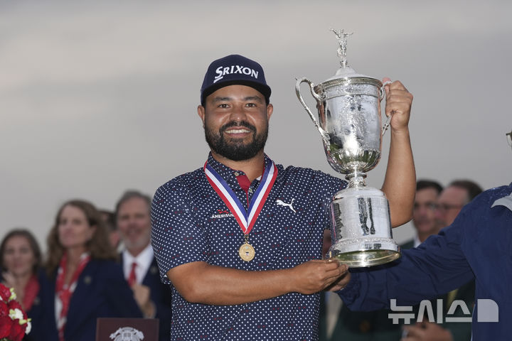 [오크몬트=AP/뉴시스] JJ 스폰(미국)이 15일(현지 시간) 미 펜실베이니아주 오크몬트의 오크몬트 컨트리클럽에서 열린 제125회 US오픈 정상에 올라 트로피를 들고 기념 촬영하고 있다. 스폰은 최종 합계 1언더파 279타로 통산 2번째 우승을 차지했으며 메이저 첫 승을 기록했다. 2025.06.16.