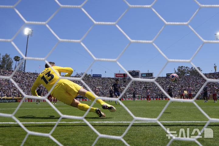 [패서디나=AP/뉴시스] 파리 생제르맹(OSG, 프랑스)의 이강인이 15일(현지 시간) 미 캘리포니아주 패서디나 로즈볼 스타디움에서 열린 2025 국제축구연맹(FIFA) 클럽 월드컵 B조 조별리그 1차전 아틀레티코 마드리드(스페인)와의 경기 후반 추가시간 페널티킥으로 팀 4번째 골을 넣고 있다. 이강인은 스페인 최고 골키퍼 얀 오블락을 상대로 PK를 성공했으며 PSG는 4-0 완승을 기록했다. 2025.06.16.