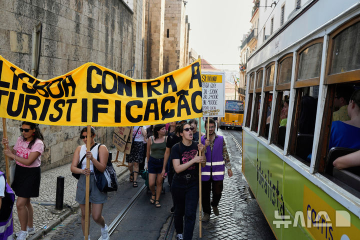 [리스본=AP/뉴시스] 15일(현지 시간) 포르투갈 리스본에서 '주거 지역 관광화(투어리스티피케케이션) 반대' 문구가 적힌 현수막을 든 시위대가 행진하고 있다. 2025.06.16.